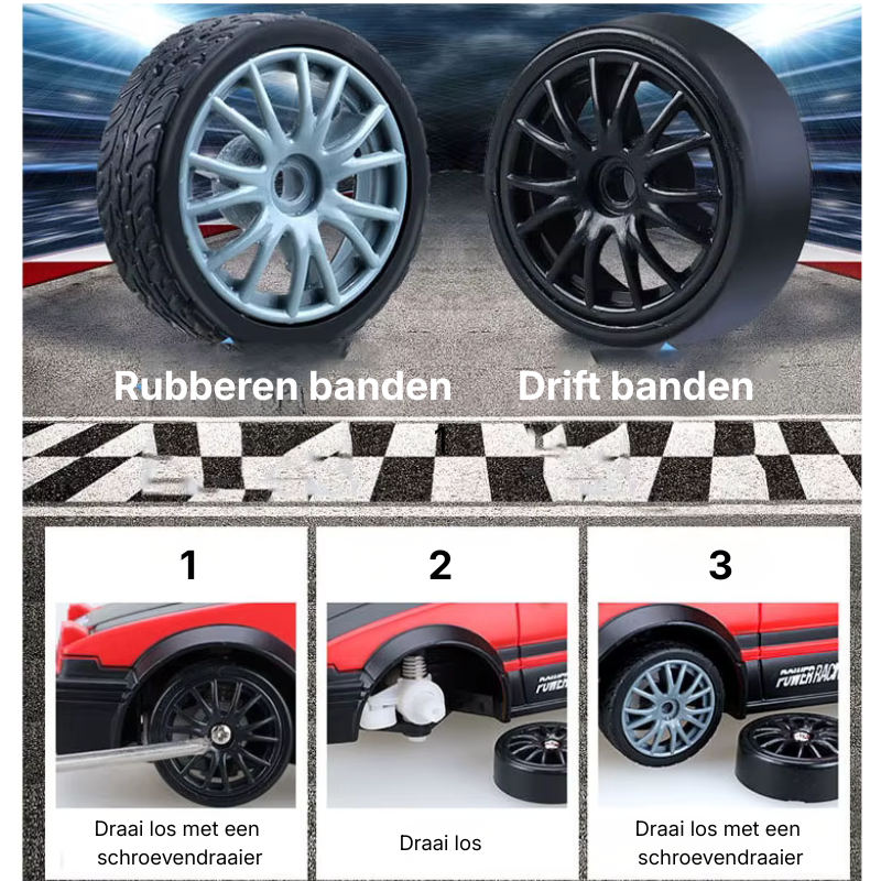 Voel de kracht, zie de drift, een snelle en wendbare RC driftauto met vierwielaandrijving en verlichting, ontworpen voor soepele drifts, scherpe bochten en eindeloos raceplezier waarbij het voelt alsof jij zelf achter het stuur zit.